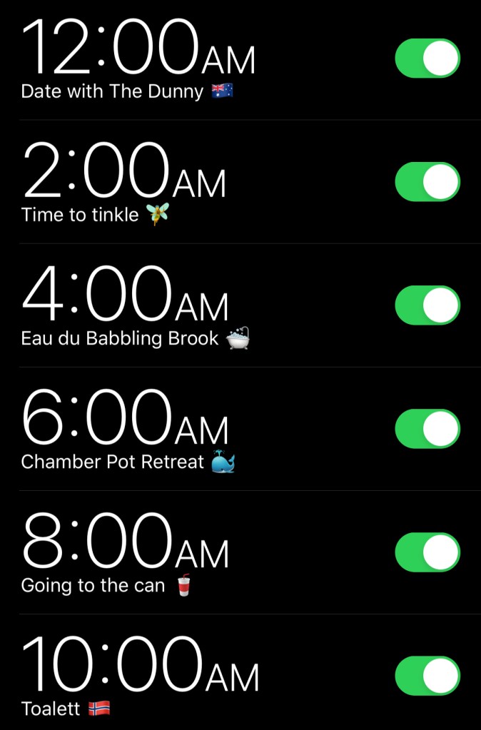 To remember, I set an alarm. And because I’m in the hospital, I came up with creative labels for said alarms: