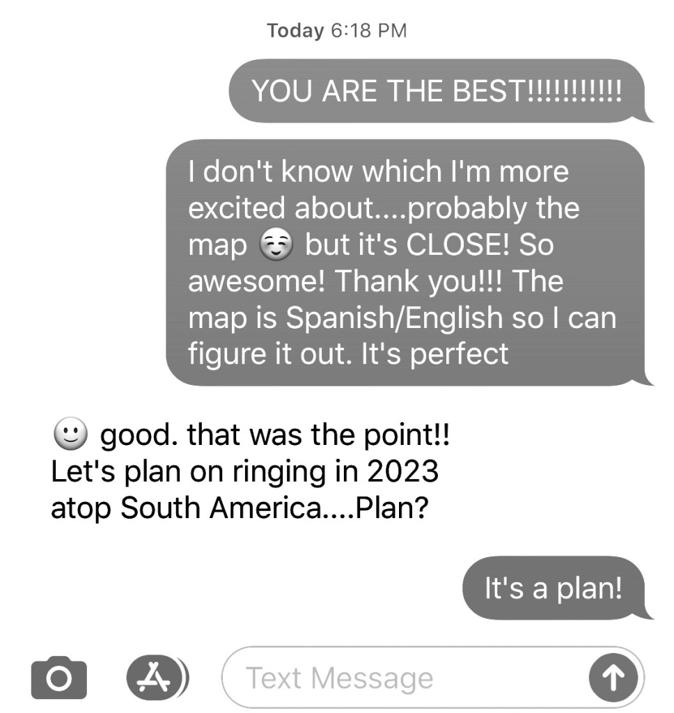 Oh – the ups and downs of a bone marrow transplant. Wonderful getting surprise from Christine – getting map of Aconcagua 🧗. I see you ringing in 2023 ✅✅ Getting pb & chocolate wasn’t bad either😊!! But the fever 🥵 wasn’t good – discomfort and all. Sorry. Thankful for Tylenol and transfusion. I marvel at your spirit and your strength. Oh, by the way, I’m baking this weekend.
