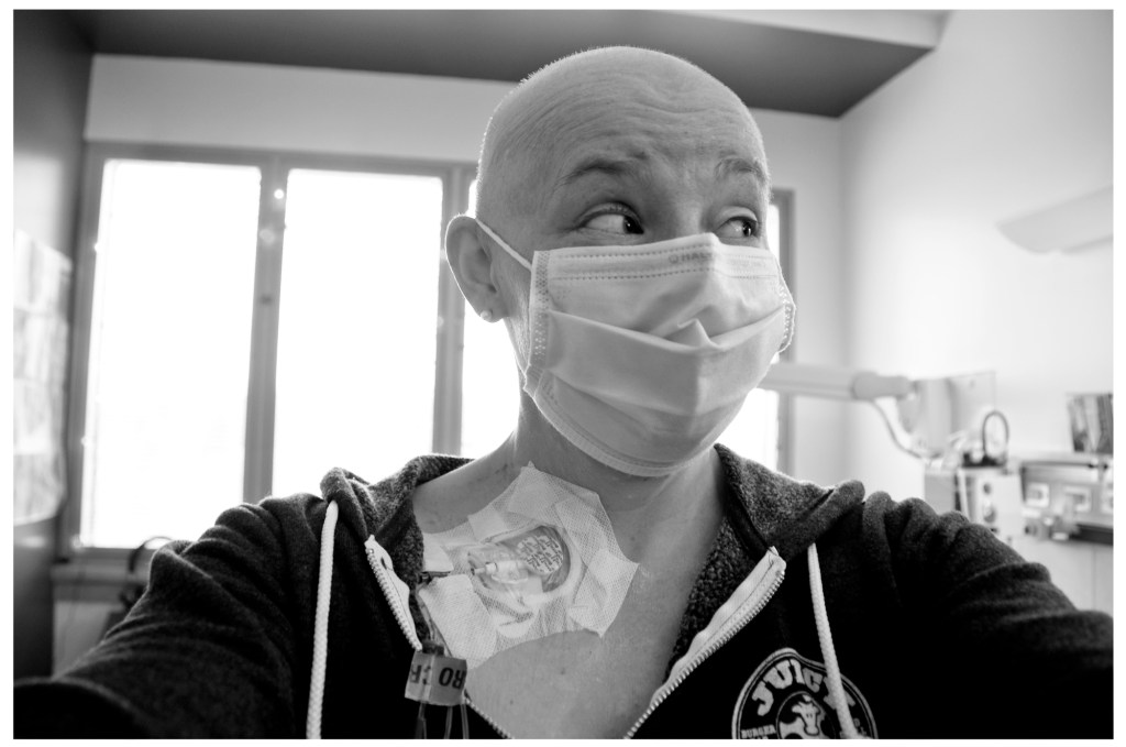 Eye roll. And a way of checking out my new Central Line dressing, which was changed today. I’ve had my line for over a month now, and so far it’s been OK. Except for the part where the Chlorhexidine has been in constant contact with my skin. It’s a very strong disinfectant and antiseptic and when Charlotte my nurse, cleaned the area, I yelped in pain. Oh, and if you look closely at my head, you can see all sorts of little stubbles of hair that just never fell out. They don’t really bother me, but I feel them at night when I move my head around on the pillow. I solve this problem by wearing a hat.