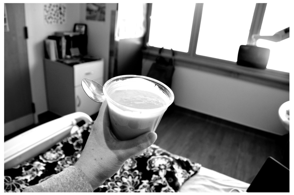 Photo of the Day: Upgraded! I’ve been upgraded from a Clear Liquid Diet to….a FULL Liquid Diet. What does this entail? Basically it adds dairy products – ice cream, shakes, yogurt, milk – to my list of approved foods/liquids, and a few other more calorie-dense things as well, such as tomato soup, blended chicken noodle soup, shakes, and smoothies. I can’t have the strawberry-banana smoothie, because berries are not allowed in my immune-suppressed state, as there’s a potential for mold in the seeds. But the mango-banana smoothie was a go. It was so good in fact, that I had two.
