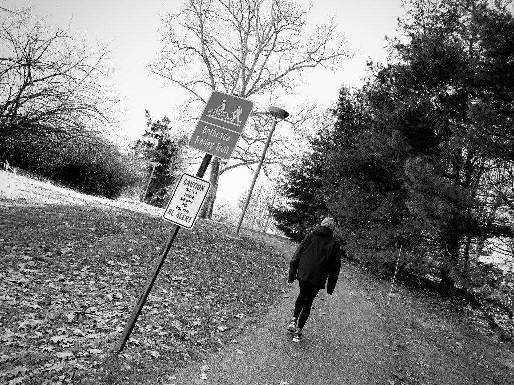 Mom, powering up a hill on the Trolly Trail. And yes, I can attest from personal experience that it is VERY IMPORTANT to be alert to bicycles. Yesterday while wearing noise-cancelling ear buds during my walk to NIH, I was nearly run over. Er….biked over. It was my own fault, a mistake that I will not soon repeat as I was in the wrong. Thankfully we gave plenty of space today whenever hearing the friendly “ding” of a cyclist.