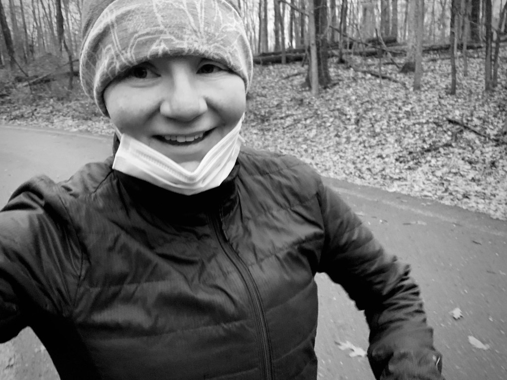 I was undeterred though, and quickly threw something together. Tights, merino wool long sleeve shirt, short sleeve t-shirt and wool jacket.Double yoga tops as a sports bra thing. Add in gloves and a grey and snowflake beanie and voila – perfect. Then Mom popped her head in and said she would be joining me and we crafted a plan: The loop at Seneca Creek Park. I would run a lap, and then run back to Mom and walk. If I felt good, I could repeat.