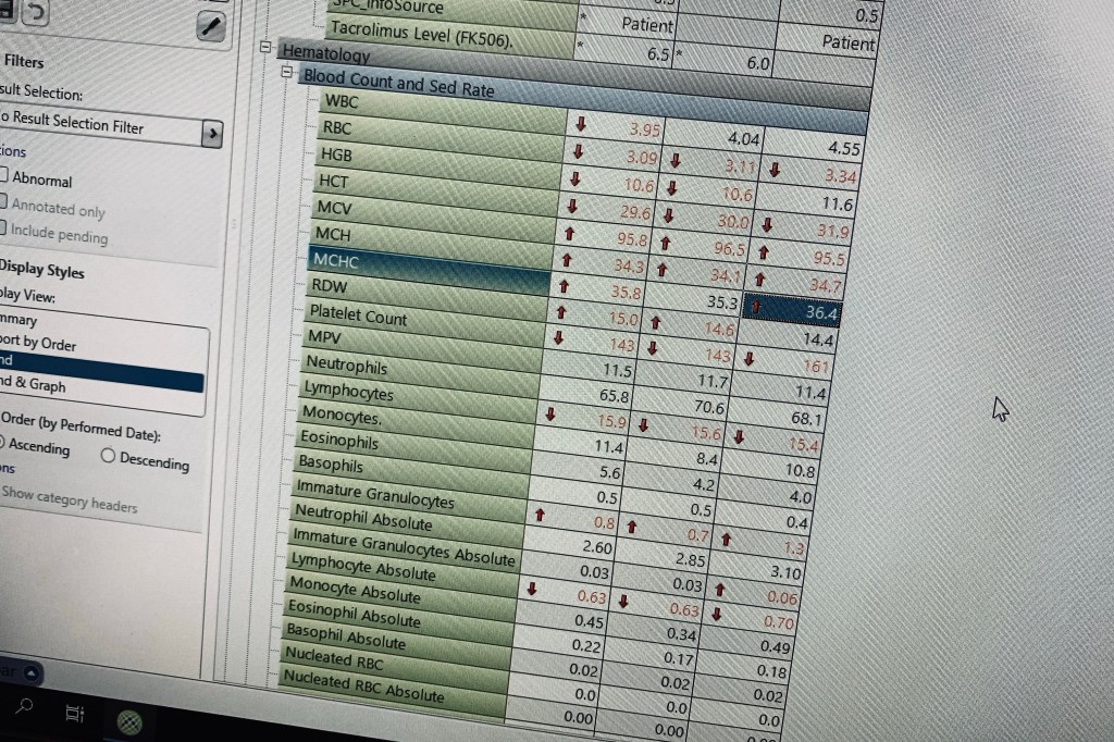 Then it was up to the Outpatient Day Hospital to meet Daniele and Erin. Once I received my room assignment, I texted Daniele and the two were down fairly quickly. Long story short – labs are looking good! The two that we are tracking – Tacrolimus (immune suppressant level) and Creatinine (kidneys function) – were reasonable. I say that because my Tacro was still below the 8.0 number that my Team wants at 6-something. However, my body seems to be doing OK with this slightly lower level, even my skin at this point seems to be recovering, and my organ function and lab results are all normal. We decided to maintain my current regime of .5 mg Tacro every morning and 1.0 mg Tacro 4X/week (MWFSaturday), alternating .5 mg Tacro the other 3 nights. We’ll recheck on Thursday.
