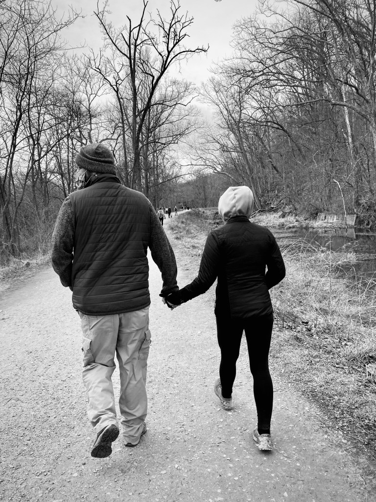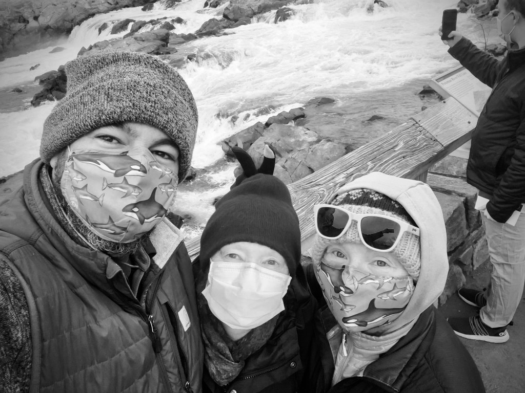 Andy’s early morning arrival (as in 2 am) meant that we slept in, at least until my 9 am medication alarm woke us up. Breakfast of pecan rolls (thank you Grace & Keith) was delicious and with my creamy tea, even more so. Today was filled with hanging around the apartment for a bit, searching for a parking spot near Great Falls park (success the second go-around), a lovely walk, a colorful bird sighting, waterfalls, chicken stir fry, too many Peanut M&Ms, and watching Season 1 of the All Souls Trilogy.