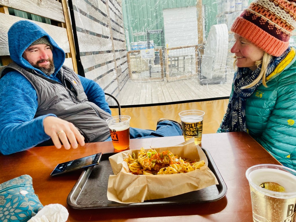 Later, Andy & I took Mom to the spot we want to build a future house together, explored some of the windy Mills River back roads and visited Bold Rock Cidery. Mom enjoyed their Pear variety, and it was something we thought she would enjoy experiencing. Yes, it was chilly, but sitting outside on a back deck wasn’t so bad. And I discovered that my wig functions as an extra layer of warmth, so that’s cool too.