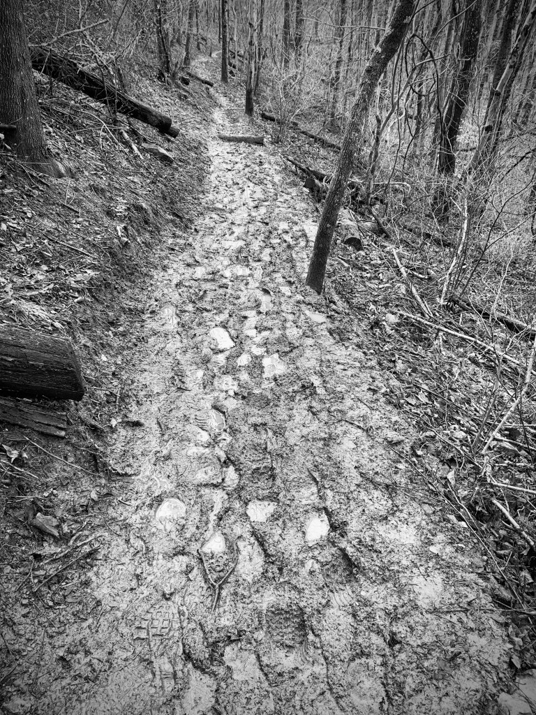 After my appointments, I spent some time in the woods, on the Mountains To Sea Trail. It was more mud than trail, which made for great, slippery fun. At some point during my hike, I developed a bloody nose…a perfect storm of blood thinners + transplant + dry, cold weather. The mask covered the evidence, and once back at the car, I could clean my face up. My shoes, well, they were a different story.