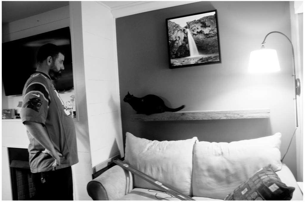 Photo of the Day (Saturday): After the accent wall was completed, Andy made a floating shelf. Monster was the perfect test subject to ensure its “structural soundness” (if that’s even a word).