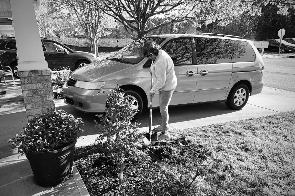 Photo of the Day (Monday): Not only does our lovely neighbor take out our recycling and help feed our kitties when we’re away, but Monday, I found her planting a bush in our front yard! Thanks Breege!