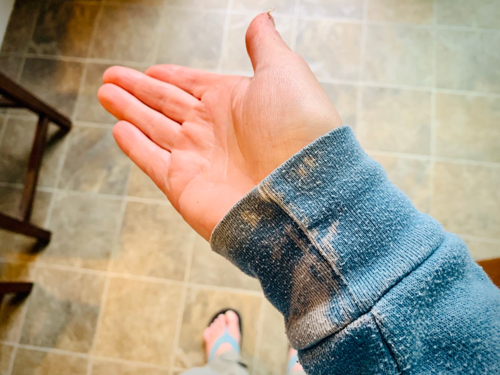 Then it was back to tasks at hand…Andy painting and me chopping veggies. At some point, after prepping my umpteenth dinner for the week, I sprayed bleach on the counter, an effort to clean the surface. Unfortunately, my beloved Durango sweatshirt, purchased after hiking the 500-mile Colorado Trail in 2019, got a bit of bleach on the sleeve.