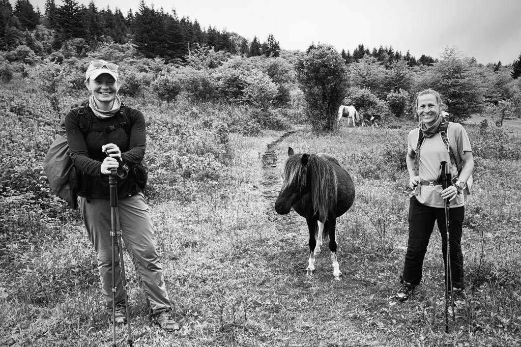 Christine coming into town was, simply put – wonderful, a great reminder of enduring friendship and our shared love of big mountains. It was a packed Memorial Day weekend involving hikes at some of the most beautiful ranges in Southeastern Appalachia. Grayson Highlands State Park contains both the Virginia state highpoint and wild ponies – the 3-hour drive from Asheville was long, but in the end worth it. We hiked 12.5 miles through beautiful cedar & fraser fir forest, islands of pines in their own Mountain kingdoms, tagged Mt Rogers (VA highpoint), and spent hours chatting as we followed the white blazes of the Appalachian Trail.