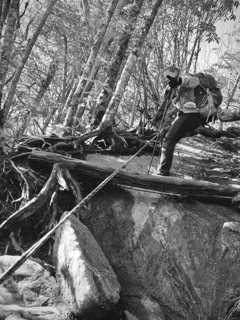 Sunday was similar, though we chose the Roan Mountain range, with three peaks on the Carolina Mountain Club’s “South By 6000” Challenge. We parked at the 5400-foot Carvers Gap, and followed the AT once again as it traced the spine Appalachia, hopscotching between North Carolina and Tennessee. It was 38 degrees when we parked at 6:45 am and we spent a misty day hiking another 12.5 miles through clouds.